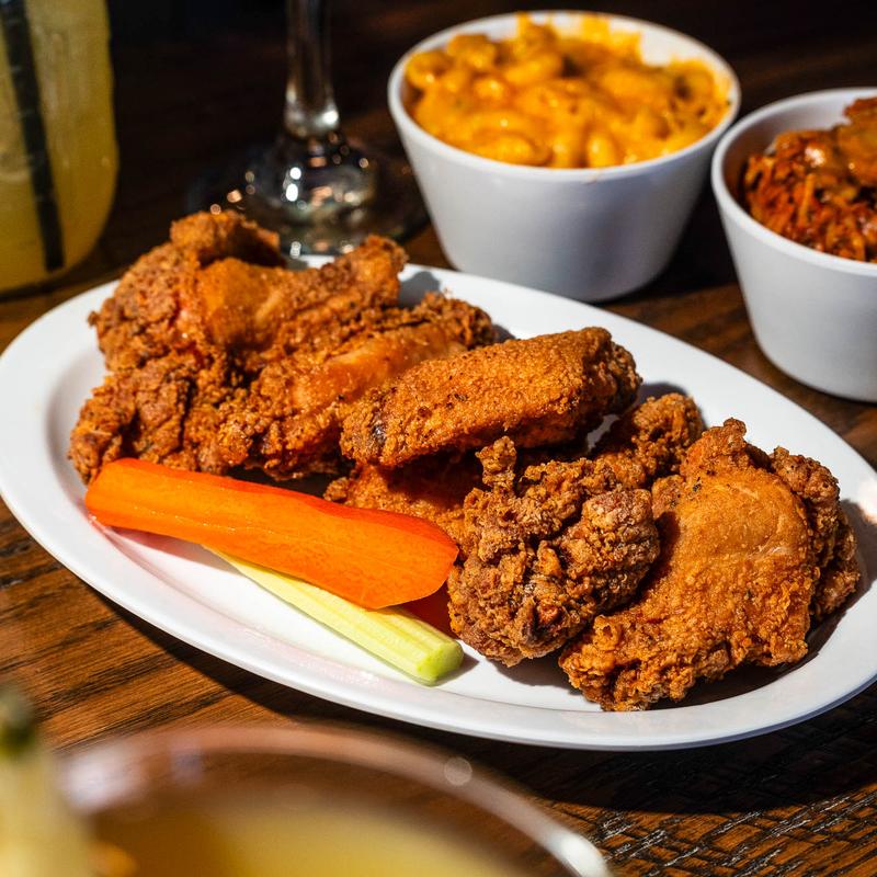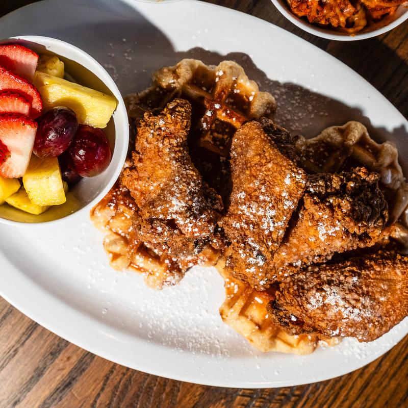 Golden Belgian waffle, topped with 4 wings & powdered sugar.