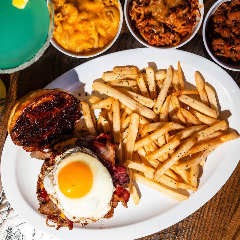Beef patty, bacon, sunny side up egg, hash browns, and bacon jam served on croissant bun.